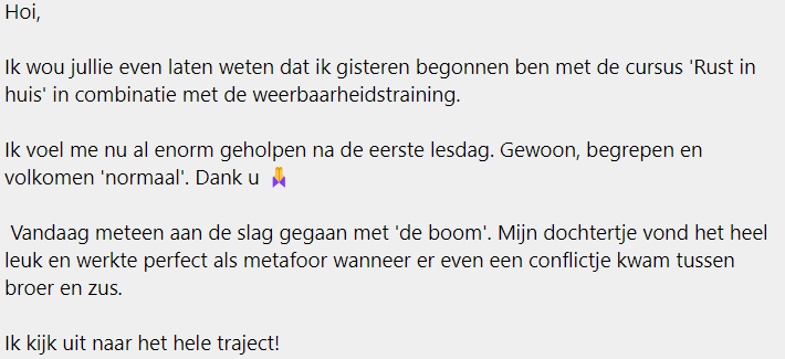 Het online leren werkt vaak zelfs nog beter, omdat je de video’s kunt bekijken op het moment dat jij hier de rust voor hebt (in plaats van bijvoorbeeld snel tussen werktijd door naar een afspraak gaan). Je hoeft voor deze cursus niet vrij te nemen. En doordat je het op je eigen gewenste moment kunt volgen, kun je ook de momenten uitkiezen waarop jouw kind open staat voor het aanleren van nieuwe vaardigheden (we nemen je daar stap voor stap in mee).
